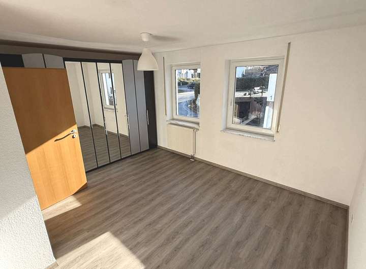 Über die Echtholzteppe gelangt man ins Obergeschoss. Hier befinden sich 1 Kinderzimmer/Büro, das geräumige Elternschlafzimmer und das Badezimmer. Auf diesem Stockwerk ist ein Laminatboden verlegt.