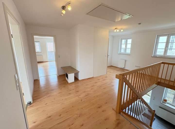 Über die Treppe gelangen Sie ins Obergeschoss in welchem Sie von der Galerie aus in ein großes Elternschlafzimmer und zwei weitere Kinderzimmer kommen. Ein Bad mit Dusche und Wanne sowie dem Waschmaschinenanschluss runden diese Etage ab.