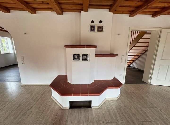 Sie finden im Erdgeschoss einen geräumigen Eingangsbereich mit Zugang zu einem Büro oder Schlafraum, ein lichtdurchflutetes geräumiges Wohn- Esszimmer mit angrenzender offener Küche sowie ein Gäste WC. Der Kachelofen im Wohnzimmer ist mit Wassertaschen ausgestattet, welche die Heizung unterstützen bzw. den Pufferspeicher mit versorgen können.