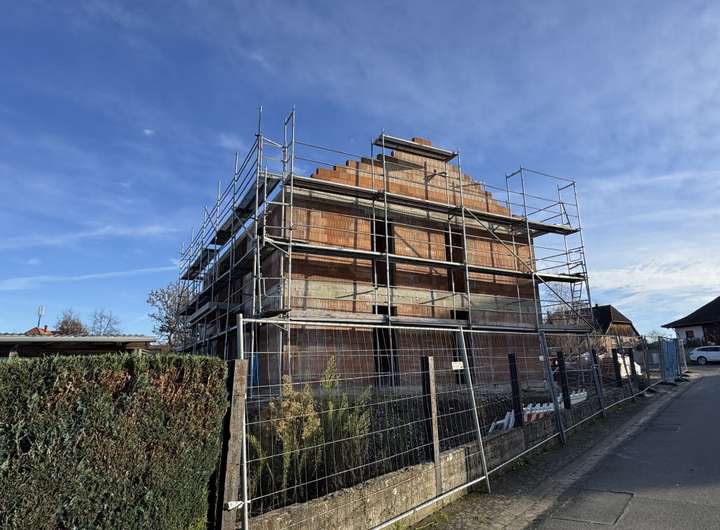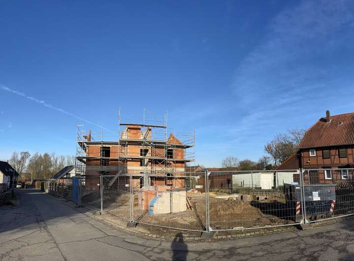 Auf dem Grundstück wurde ein modernes Zweifamilienhaus geplant und genehmigt und der Rohbau ist bereits nahezu vollständig erstellt. Dadurch reduziert sich der Aufwand für die spätere Fertigstellung erheblich.