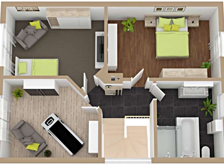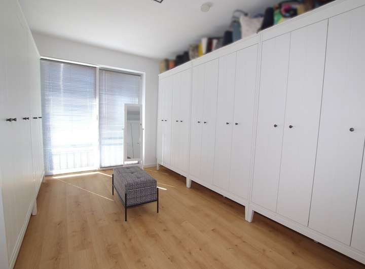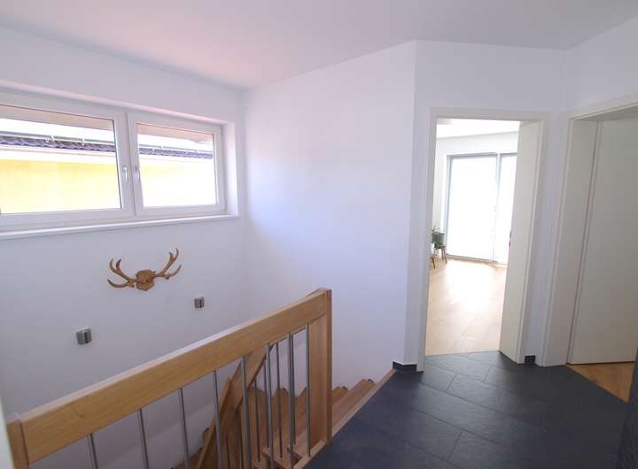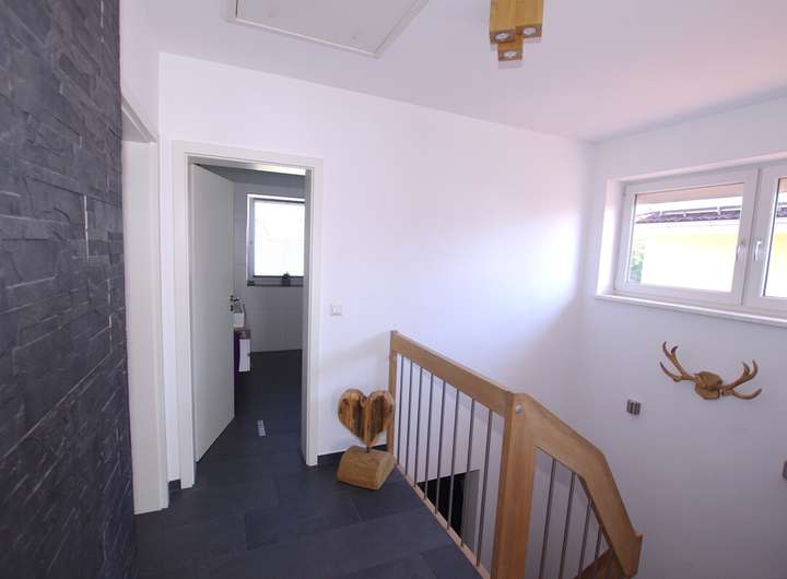 Das Obergeschoss bietet drei gut geschnittene Zimmer, die sich flexibel als Schlaf-, Kinder- oder Arbeitszimmer nutzen lassen. Ein luxuriöses Badezimmer mit bodengleicher Echtglas-Dusche und freistehender Badewanne rundet diese Etage ab.