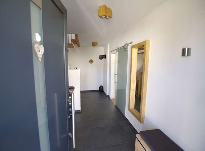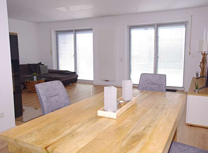 Im Eingangsbereich erwarten Sie eine Garderobe, sowie ein Gäste-WC. Dahinter öffnet sich der großzügige, lichtdurchflutete Wohn- und Essbereich mit offener Küche. Hier sorgt ein neuwertiger Kamin der Marke Hase mit doppelverglastem Feuerraum und einer Leistung von 6 kW für eine behagliche Wohnatmosphäre. Von diesem Bereich aus gelangen Sie in den pflegeleicht angelegten Garten mit einer weitläufigen Südwest-Terrasse – ein perfekter Ort zum Entspannen und Genießen. Die moderne Einbauküche mit Kochinsel fügt sich harmonisch in den Raum ein und lädt zu geselligen Kochabenden ein.