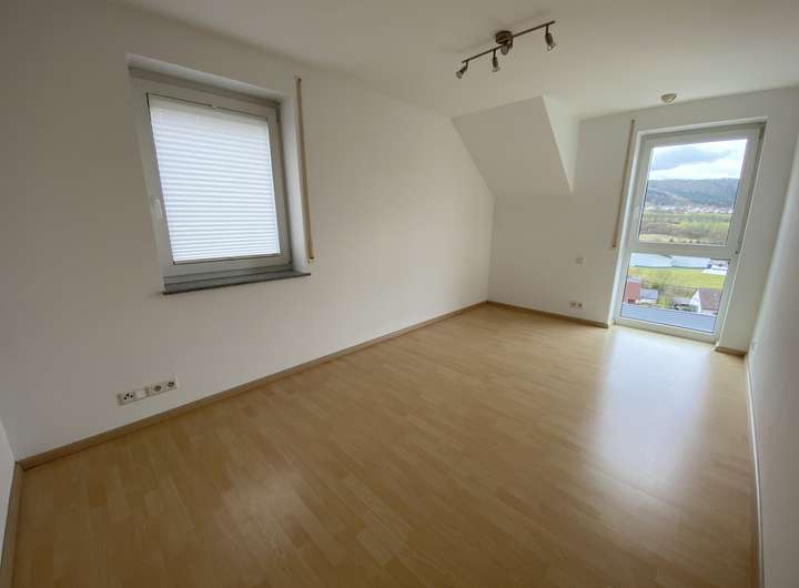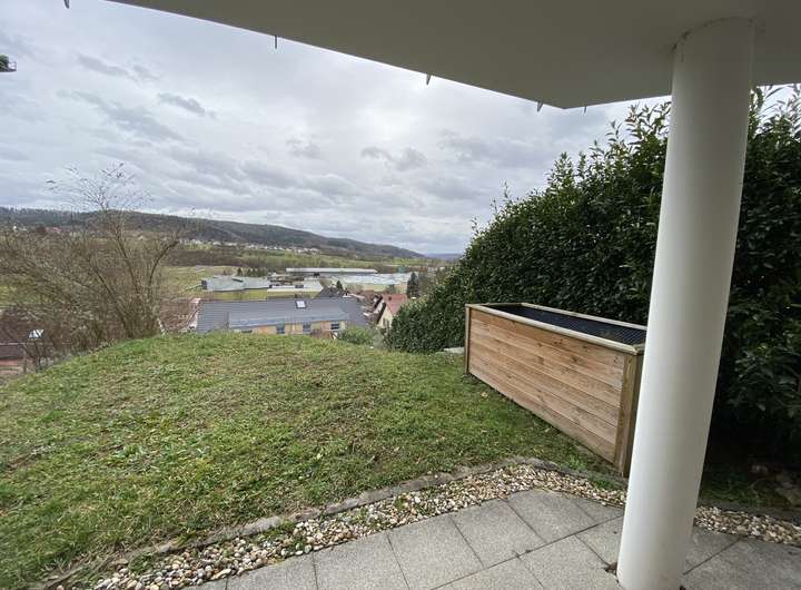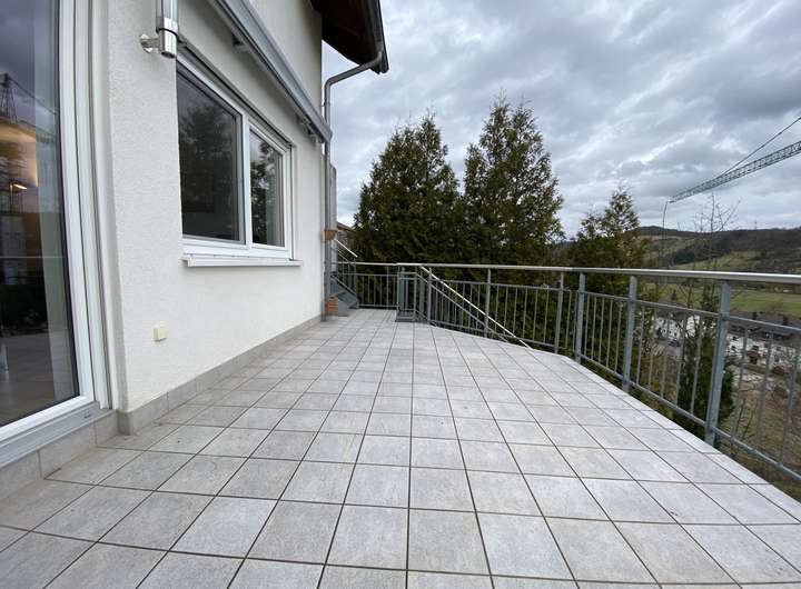 Durch eine Türe gelangt man in das ca. 37 qm große Wohn- und Esszimmer mit Zugang zum großzügigen Balkon mit Fernsicht und mit Treppe in den Garten.