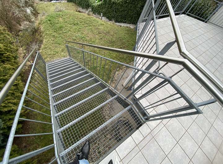 - Balkon mit moderner Markise, Garten auf 2 Ebenen