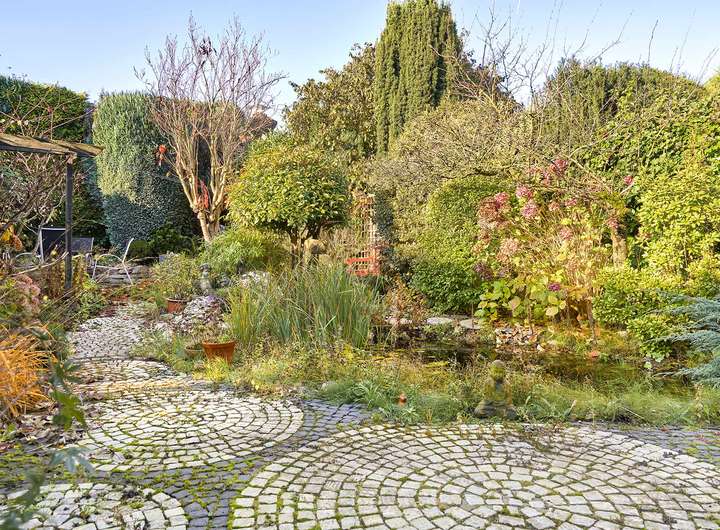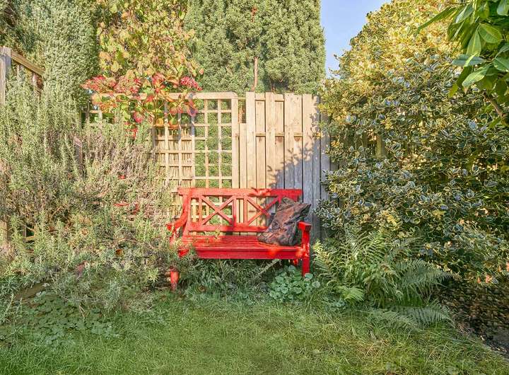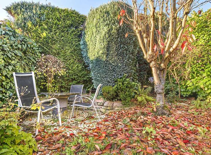 Der liebevoll gepflegte Außenbereich dient als geschützter Rückzugsort im Grünen. Die ansprechende Gestaltung schafft eine ruhige und private Atmosphäre, ideal, um die Natur zu genießen und entspannte Stunden im Freien zu verbringen.