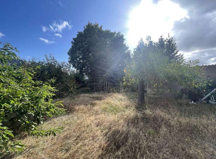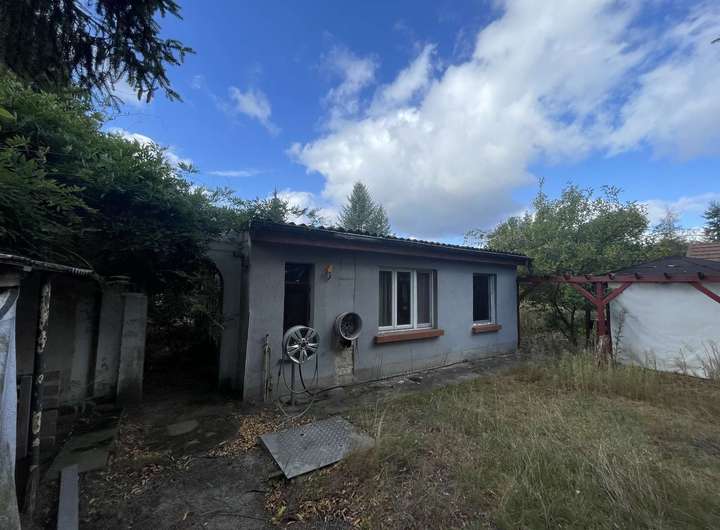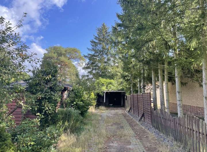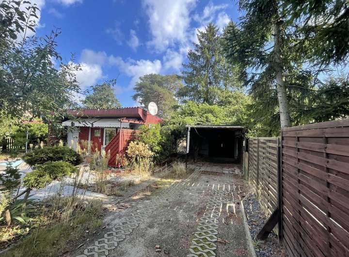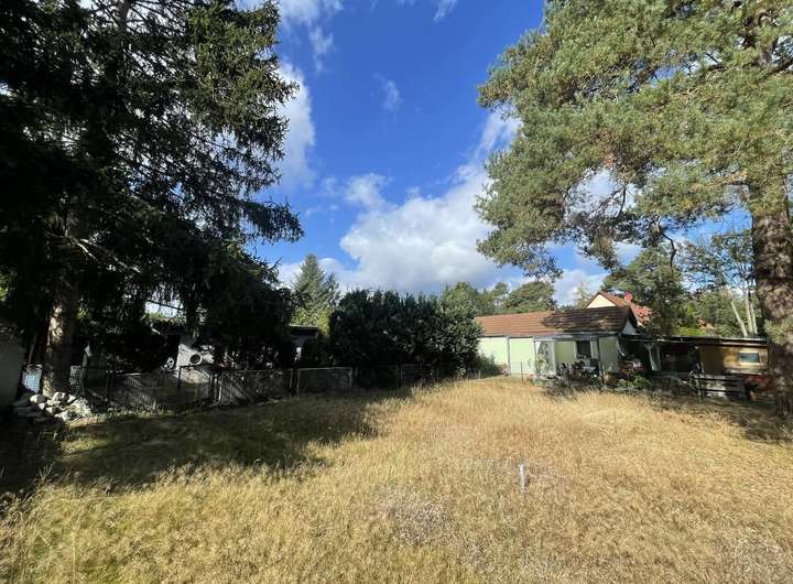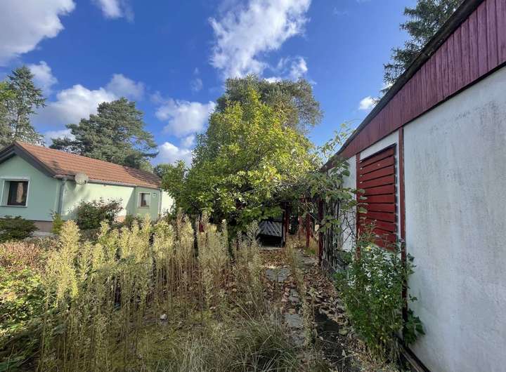 Bislang ist das Grundstück mit einer leeren, eingeschossigen, nicht unterkellerten, massiv gebauten, ca. 52 m² großen Wohnlaube, sowie einer massiv gebauten, ca. 16 m² großen Einzelgarage, einem ca. 30 m² großen Holzunterstand mit Terrasse und einem ca. 15 m² großen Gartenhaus bebaut. Dieses kleine Häuschen ist ebenfalls ungenutzt.
