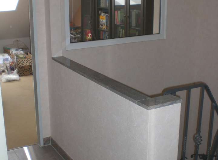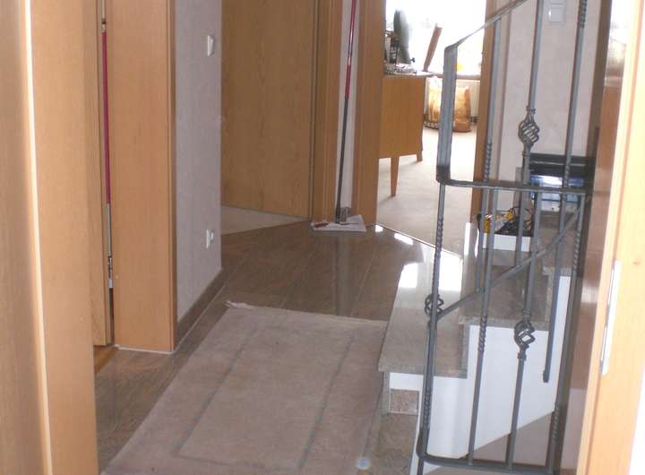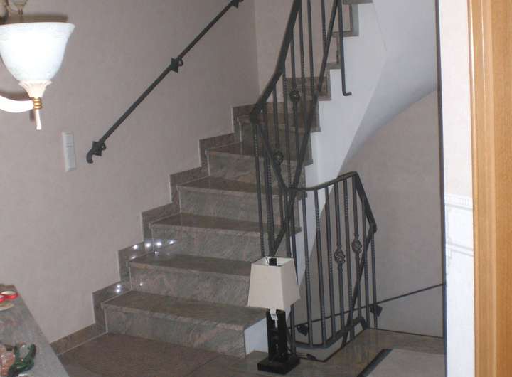 Großzügige helle Diele und Treppenhaus in Granit (ind. Juparana) und Schmiedeeisengeländer über Etagen.