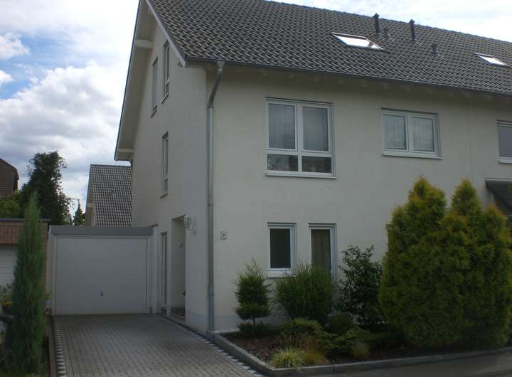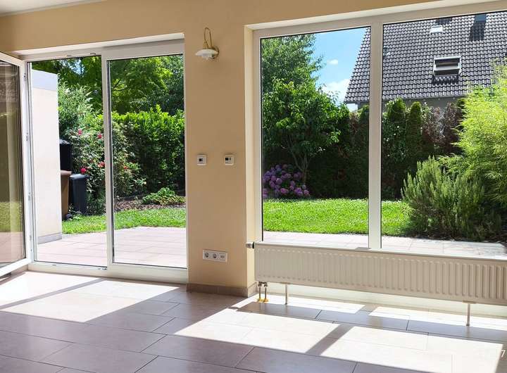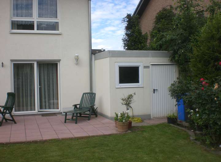Helle und luxuriös ausgestattete Doppelhaushälfte mit überlanger Garage und schönem Süd-West Garten mit großer Terrasse in ruhiger Rheinnähe.