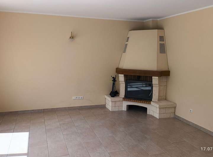Großzügiger heller Wohn/Essbereich mit großem offenen Kamin und Ausgang zur Terrasse und Garten.