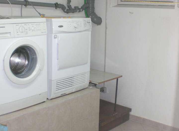 Waschküche mit hohem Sockel für Waschmaschine und Trockner, mit Waschbecken.