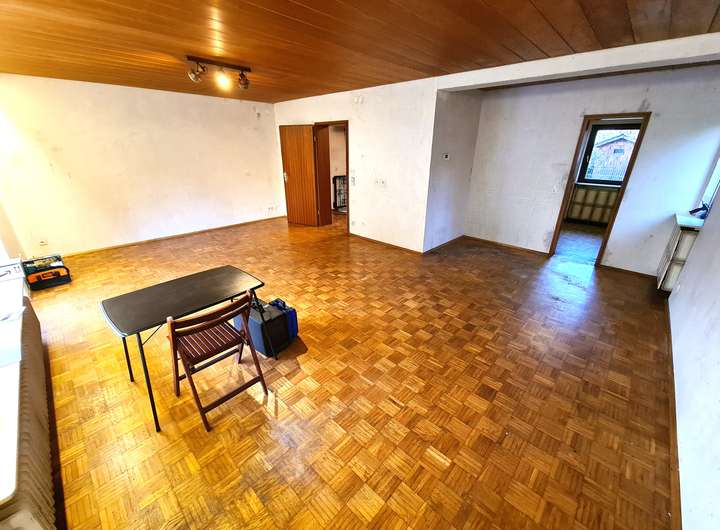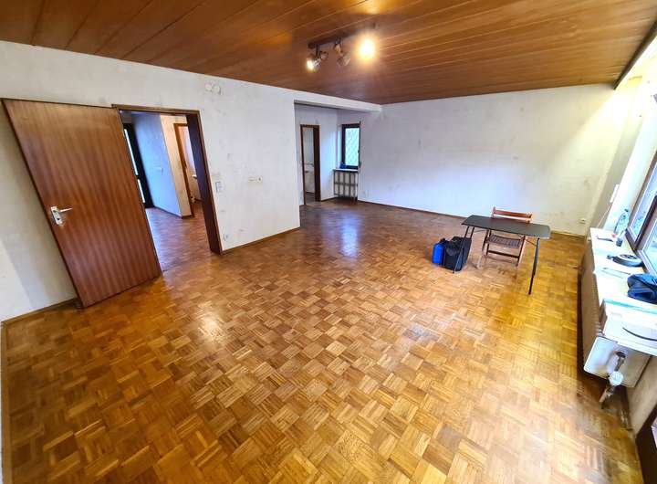 Der mit ca. 35 m² großzügige Wohn-/ Essbereich mit Parkett bietet Ihnen direkten Zugang auf die Terrasse und in den Garten. Die Terrasse hat eine Markise.