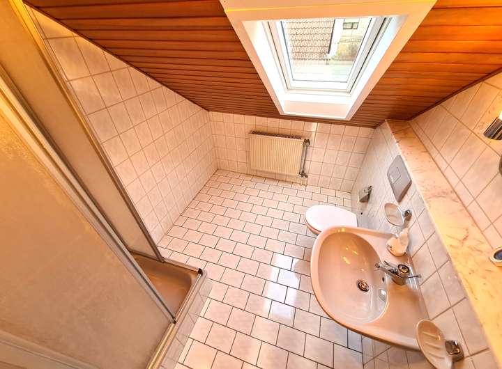 # Tageslicht-Badezimmer mit Dusche, WC, Handwaschbecken und Heizung im Obergeschoss