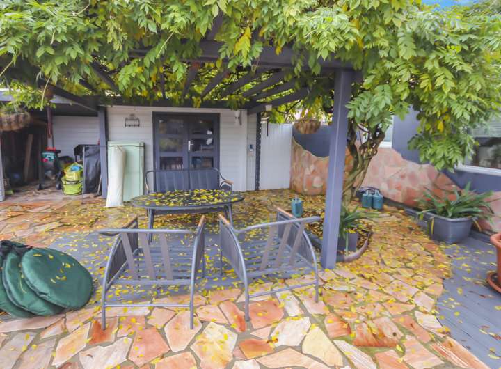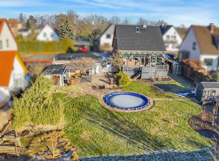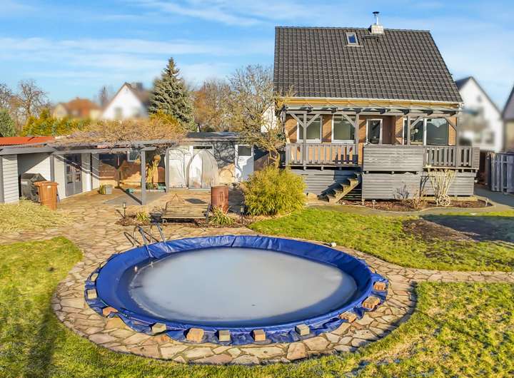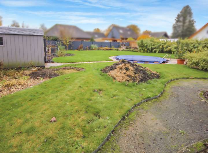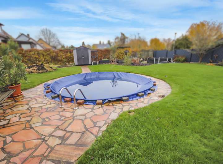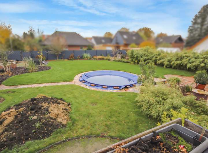 Das Grundstück ist angelegt mit Rasen, Blumenbeeten, Obstbäumen, Hecken und einem Swimmingpool.