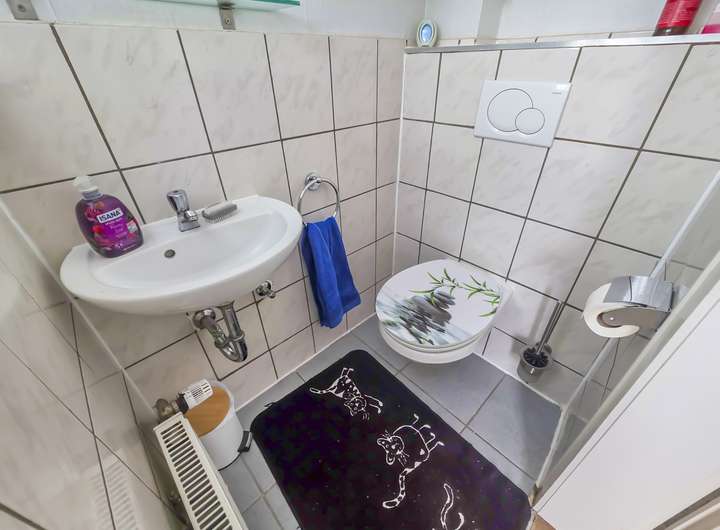 Fußboden Fliesen. Wände halbhoch gefliest.