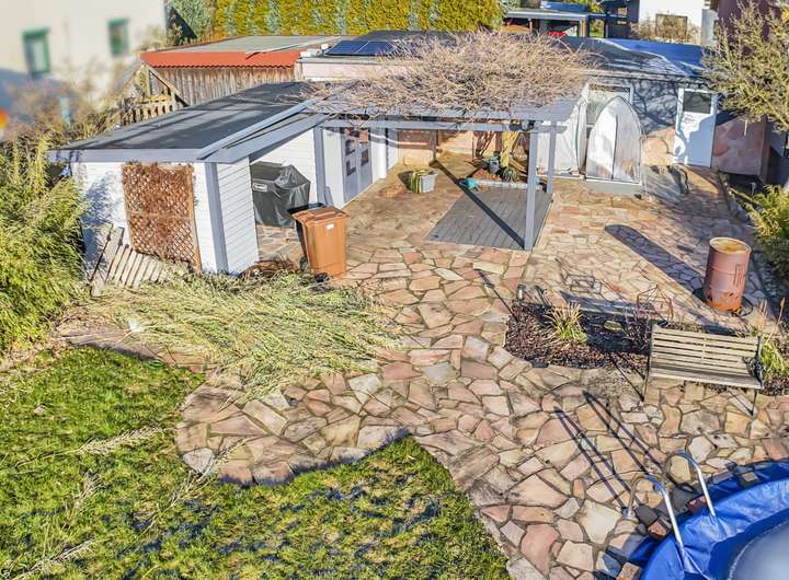 Ein Gartenhaus bietet Platz für diverse Gartengeräte.