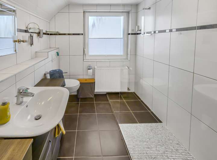 Wandhängendes WC, bodengleiche begehbare Dusche.
