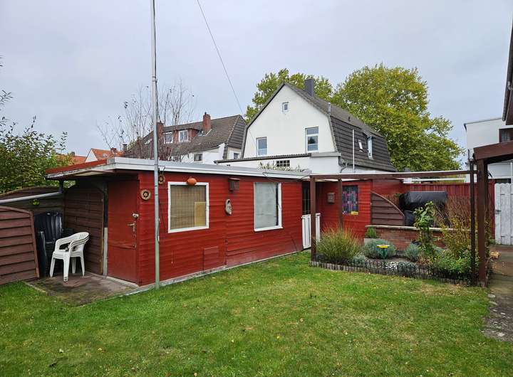 Der gepflegte Garten bietet den Bewohnern eine grüne Oase mitten in der Stadt. Eine große Gartenhütte schafft zusätzlichen Stauraum für Gartenutensilien, Fahrräder oder Grillzubehör.