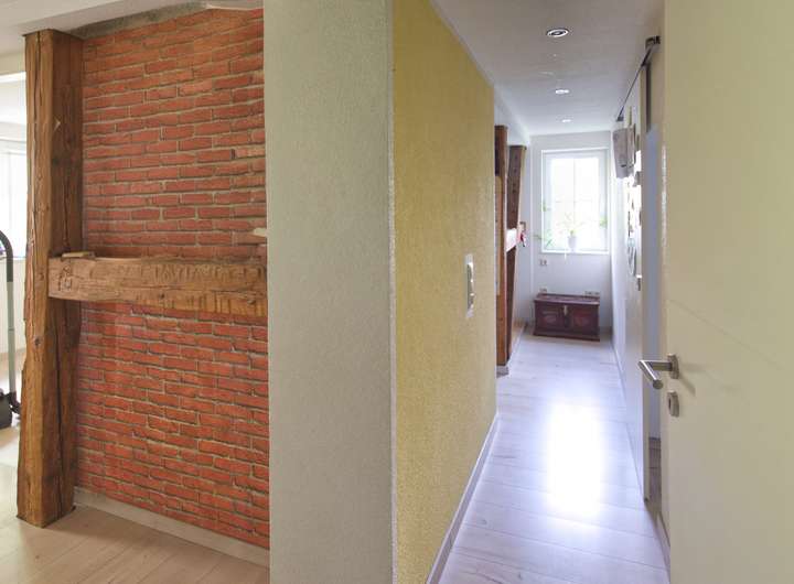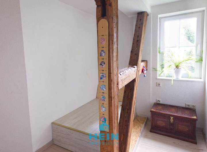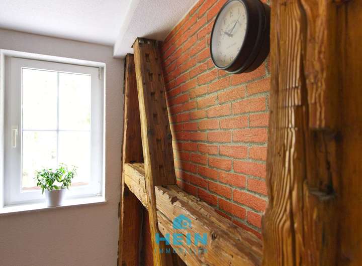 Das Obergeschoss bietet mit rund 81 m² ein ganz besonderes Wohnambiente. Hier wurde 2015 aufwendig modernisiert und ein großzügiger, heller Wohnbereich geschaffen. Mittelpunkt ist die große Wohnküche mit integriertem Essbereich, in der wunderschön aufgearbeitete Holzbalken den Charakter des Hauses unterstreichen. Das angrenzende Wohnzimmer mit Kamin lädt zu gemütlichen Stunden ein. Ein modernes Badezimmer mit Wanne und Dusche bietet höchsten Komfort. Ergänzt wird diese Ebene durch ein geräumiges Kinderzimmer, eine kleine Spiel- oder Leseecke am Ende des Flures sowie ein praktisches Büro, das sich auch als Gästezimmer nutzen lässt.