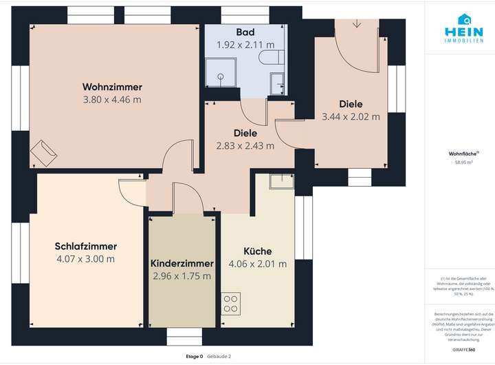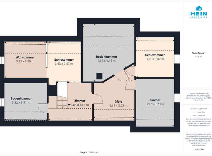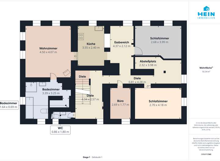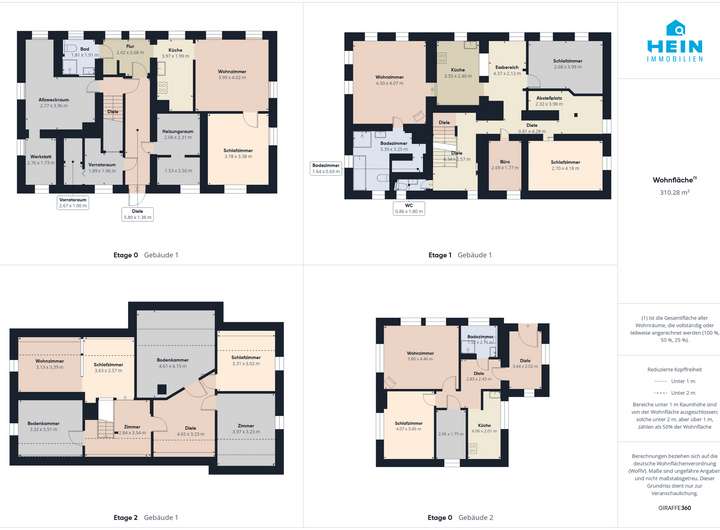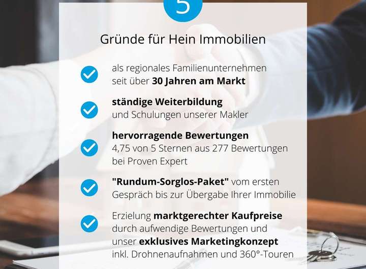 Die Angaben und Unterlagen zum Objekt basieren auf Informationen Dritter, die der Firma Hein Immobilien erteilt wurden. Für deren Richtigkeit wird keine Haftung übernommen. Insbesondere haben wir die Wohnflächenangaben des Verkäufers nicht durch eine eigene Wohnflächenberechnung überprüft. Auch kommt es teilweise vor, dass die Angabe des Baujahrs nicht exakt stimmt und es zu geringfügigen Abweichungen kommt. Dies bitten wir in Ihrer Objekteinschätzung mit einfließen zu lassen.