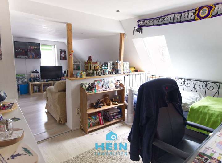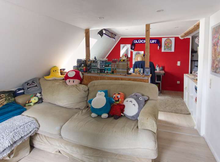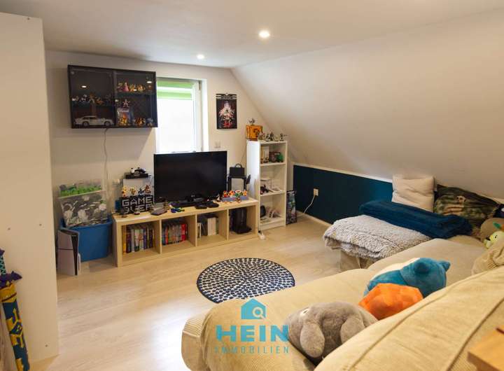 Im Dachgeschoss stehen rund 63 m² zur Verfügung. Der Bereich beherbergt aktuell ein großzügiges Jugendzimmer, das viel Platz zum Wohnen, Spielen oder Entspannen bietet. Gleichzeitig besteht hier noch weiteres Potenzial für einen zukünftigen Ausbau, sodass zusätzliche Wohn- oder Nutzfläche geschaffen werden kann – ideal, um die Immobilie auch langfristig flexibel an die Bedürfnisse der Bewohner anzupassen.