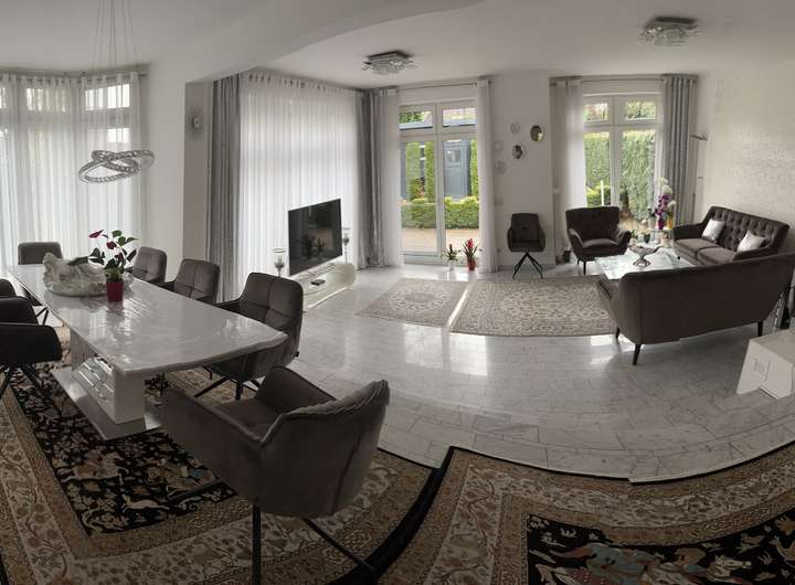 Im Erdgeschoss betreten Sie den Eingangsbereich, links befindet sich die Küche und rechts das Gäste-WC. Geradeaus öffnet sich der Wohn - und Essbereich (Deckenhöhe ca. 2,80 m) mit seinem herrlichen Blick auf die große Terrasse und den schönen Garten.