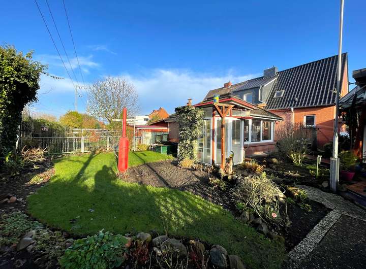 Das 447 m² große Erbpachtrundstück ist angenehm pflegeleicht angelegt – ideal für alle, die einen schönen Garten schätzen, ohne viel Zeit investieren zu müssen. Der Garten bietet einen geschützten Rückzugsort und verfügt unter anderem über eine überdachte Terrasse – perfekt für entspannte Stunden im Freien.