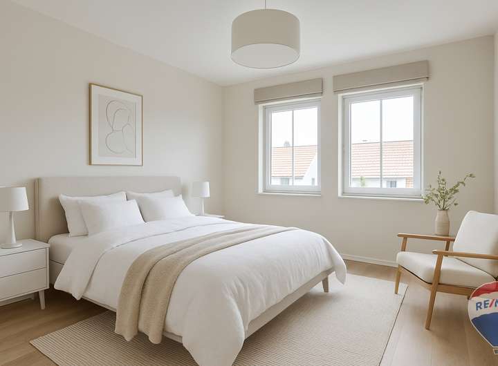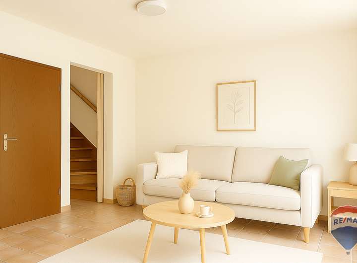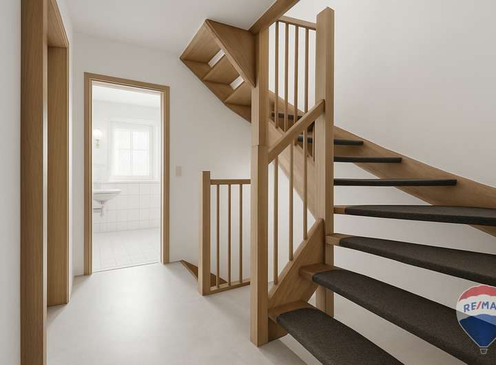 Der großzügige Wohn-Essbereich ist direkt vom Flur aus zugänglich und lädt zu entspannten Stunden mit der Familie oder Freunden ein. Von hier aus gelangen Sie auch auf die einladende Terrasse, die sich ideal für Sommerabende im Freien eignet. Die Küche ist funktional vom Flur zugänglich und bietet die Möglichkeit, sie zum Wohn-Essbereich hin zu öffnen. Ein Gäste-WC im Erdgeschoss sorgen für den nötigen Komfort im Alltag.
