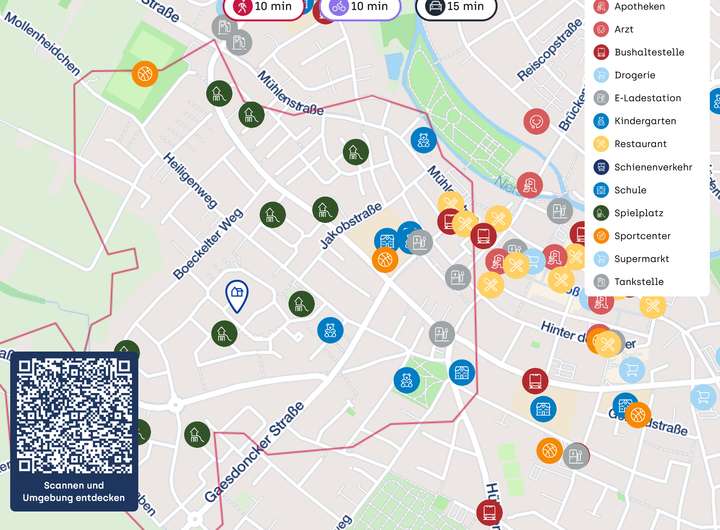 Das Zentrum von Goch ist nur wenige Minuten entfernt und bietet eine Vielzahl an Restaurants, Cafés und Geschäften des täglichen Bedarfs. Für Pendler bietet Goch mit dem eigenen Bahnhof sowie der Nähe zur Autobahn A57 eine hervorragende Verkehrsanbindung in Richtung Kleve, Nijmegen oder Düsseldorf.