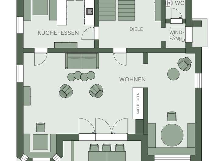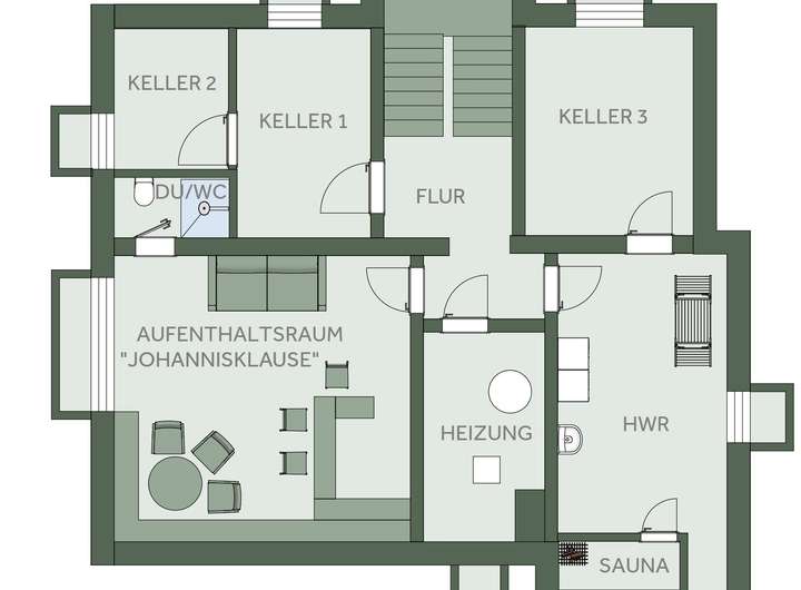 Der großzügig ausgebaute Kellerbereich enthält neben einem wunderschönen bayrisch-traditionellen Raum, der vielseitig verwendbar ist und an den auch ein Bad angrenzt, mehrere praktische Räume mit handgefertigten Holzregalen sowie einen Raum, der als Wellness- u. Fitnessbereich gestaltet werden kann. Alle im UG befindlichen Flächen werden hier nicht in die Wohnfläche einbezogen, sondern nur als Nutzfläche gewertet.