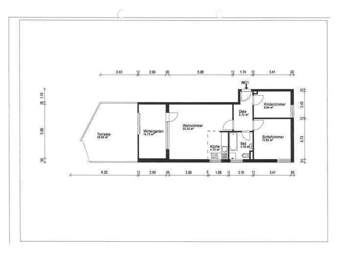 eine ca. 28 m² große Terrasse, wovon 7 m² (ein Viertel) in die Wohnfläche eingerechnet sind