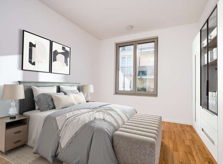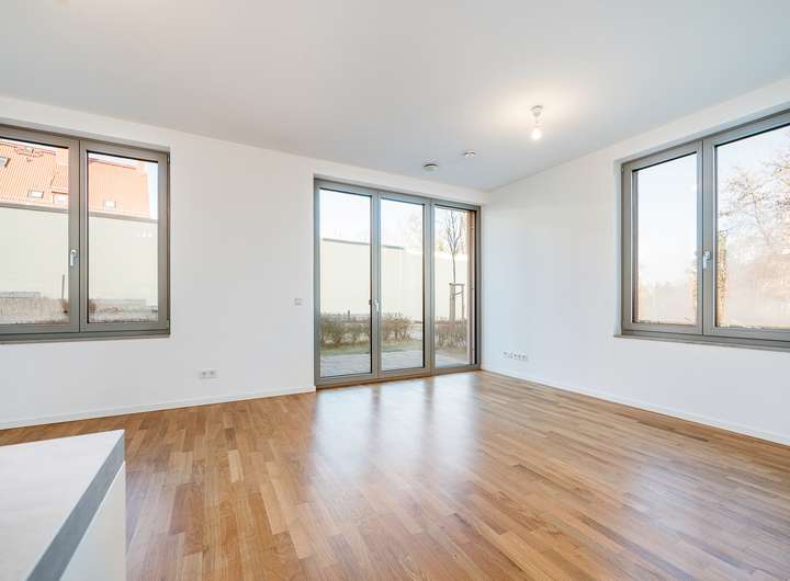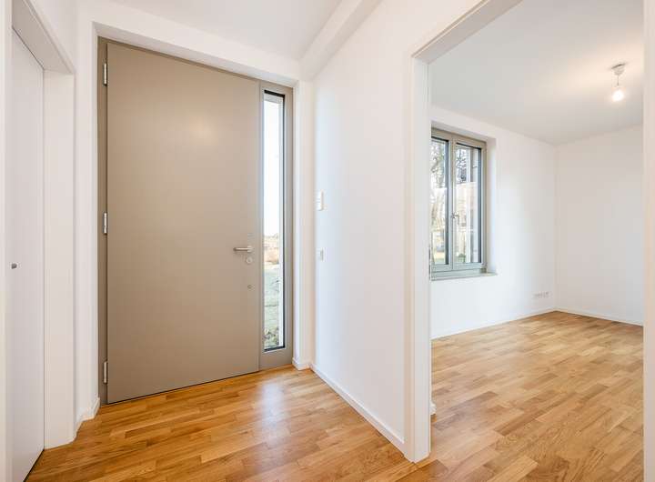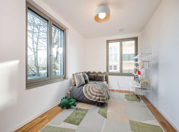 Die ökonomisch geschnittene Familienwohnung mit vier Zimmern und einem offenen ca. 31 Quadratmeter großen Küchen-, Ess- und Wohnbereich befindet sich im Erdgeschoss im "Haus 5". Der Gemeinschaftsbereich ist nach Süden ausgerichtet, die zwei weiteren Zimmer orientieren sich nach Osten zum ruhigen, grünen Hof.