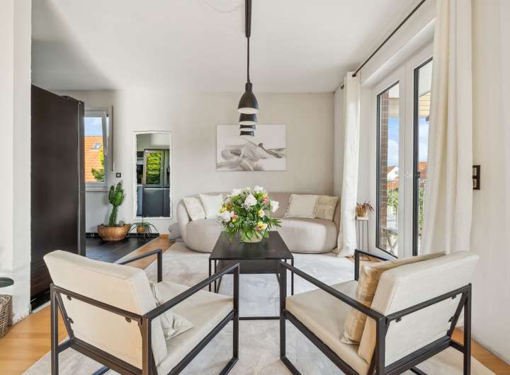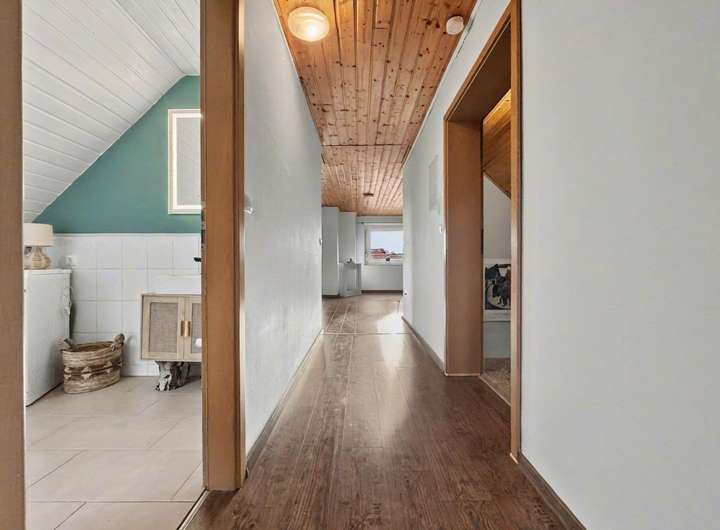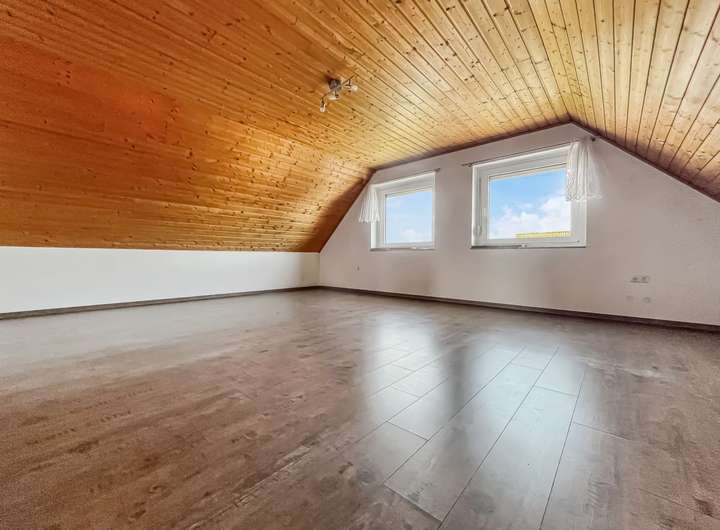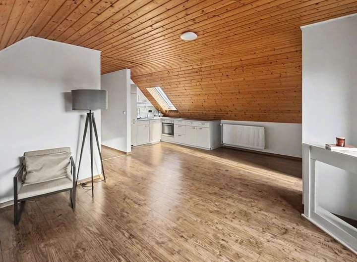 Weiterhin finden Sie im ausgebauten Dachgeschoss ebenfalls ein Wohnzimmer mit offener Küche, ein großes Schlafzimmer, ein Badezimmer sowie eine Diele und einen Balkon vor.