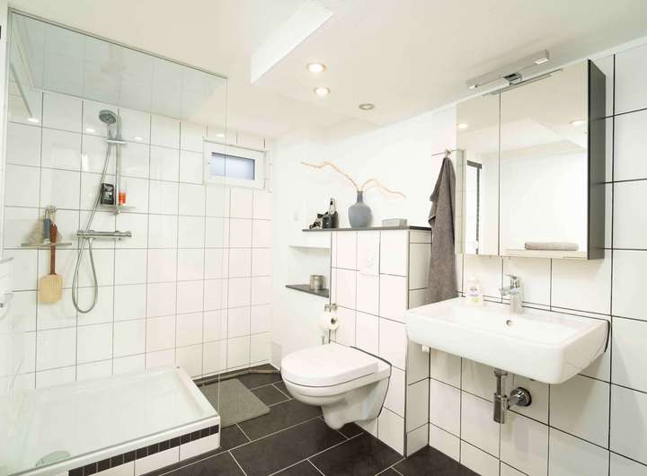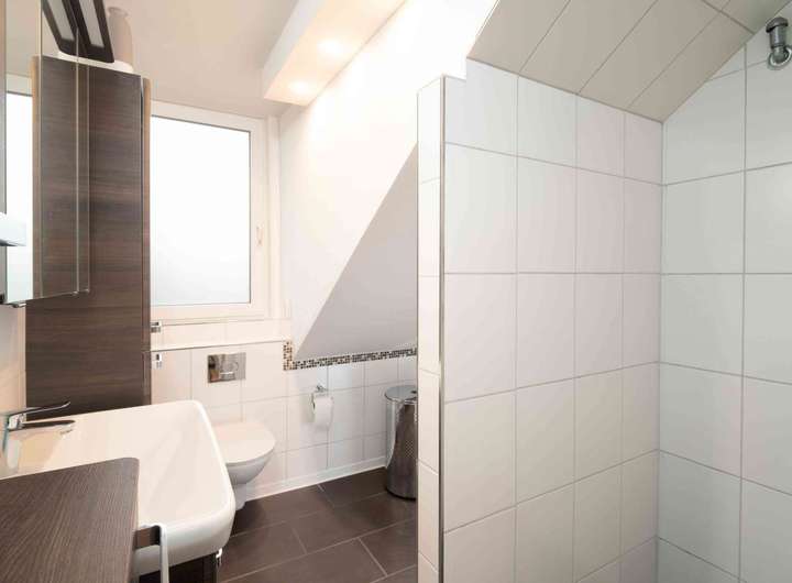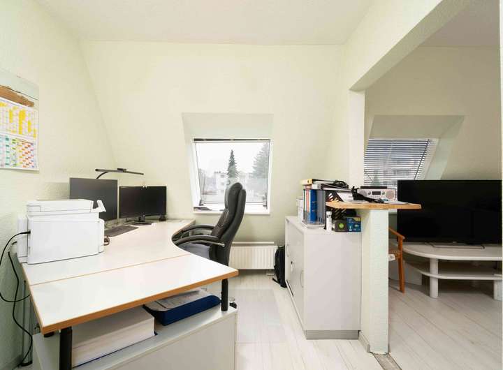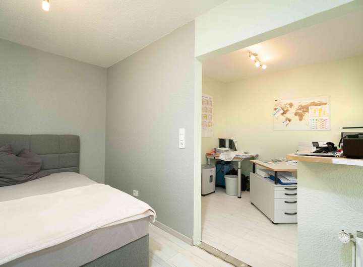 Im Esszimmer führt die Treppe in das Obergeschoss sowie hinunter in den Keller. Dort befinden sich zwei Kellerräume und ein modernes Badezimmer. Oben angekommen befindet sich rechts das Badezimmer mit einer Dusche. Weiter geht es in das Schlafzimmer sowie in ein weiteres Zimmer, das zuletzt als Büro und Schlafraum genutzt wurde. Hier wurde ein Deichbruch geschaffen, um beide Räume zu verbinden. Wer wieder zwei getrennte Zimmer benötigt, kann dies problemlos herstellen.