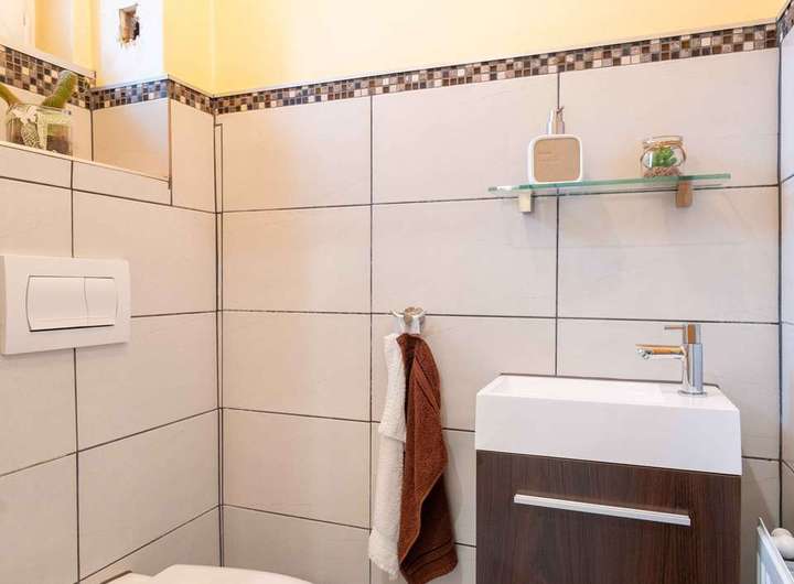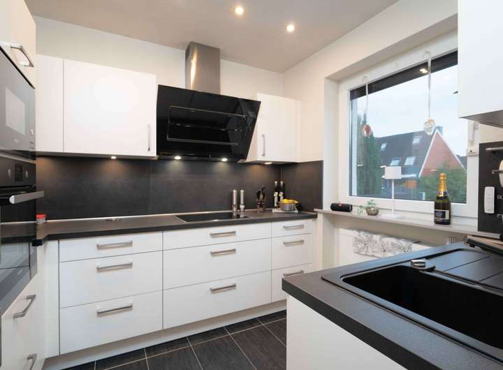 Zurück im Eingangsbereich liegt rechts die moderne Küche. Neben dem Eingang befindet sich das Gäste WC.