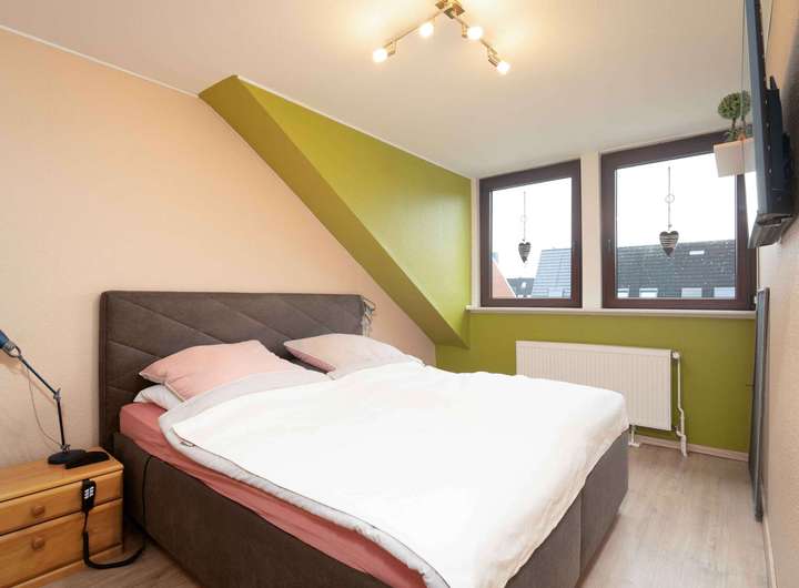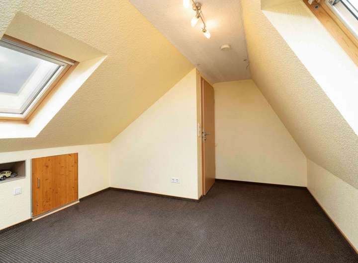 Eine Raumspartreppe führt weiter in das Dachgeschoss. Dort wartet ein zusätzliches Schlafzimmer, ruhig gelegen und mit dem typischen Charakter eines ausgebauten Dachraumes.