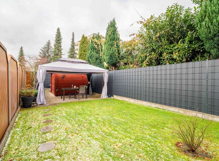 Der Garten ist pflegeleicht angelegt. Die Bewässerungsanlage erleichtert den Alltag, und der vorhandene Schuppen ergänzt den Außenbereich sinnvoll. Zwei Garagen gehören ebenfalls zum Haus.