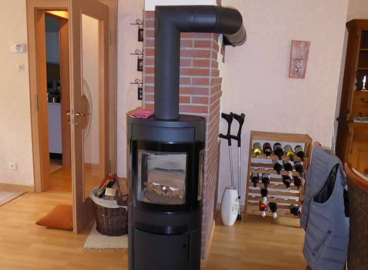 großzügiges Wohnzimmmer mit Essbereich und mittendrin der Kaminofen für wohlige Atmosphäre, Küche und Duschbad