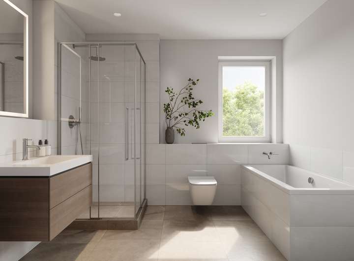 Ihr neues Badezimmer bietet volle Ausstattung, inklusive Badewanne, bodengleicher Dusche und