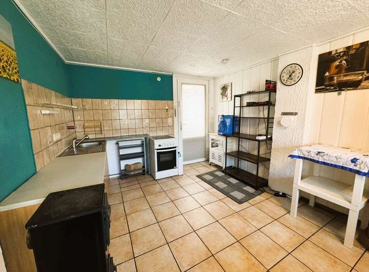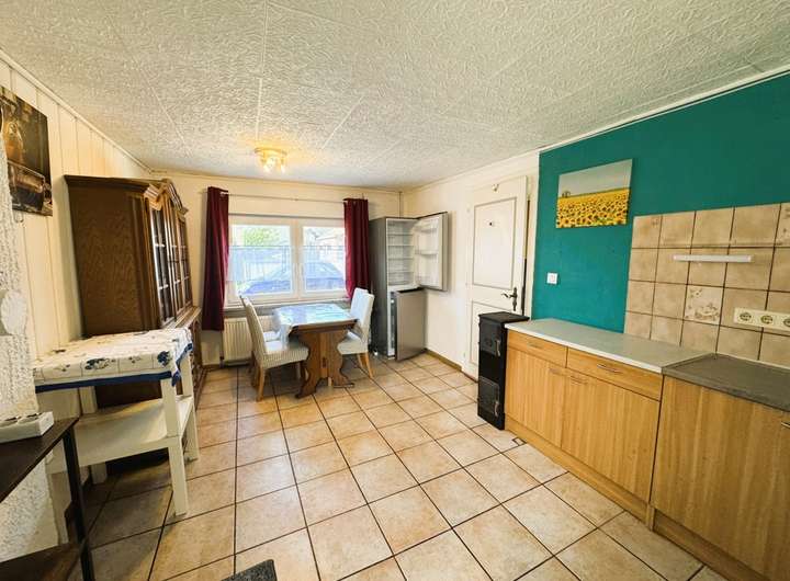 Auch dieser Raum ist gefliest. Hier gibt es genug Platz für einen großen Tisch. Eine Küchenzeile mit Herd ist hier verbaut.