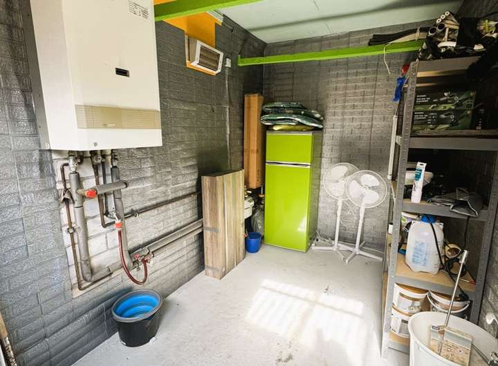 Auch ein Flachdach-Nebengebäude ist hier untergebracht. Dieses beherbergt die Therme (Junkers, 1995). Der Raum ist abschließbar und somit auch ideal zum Unterstellen für Gartenmöbel, E-Bikes etc. geeignet.