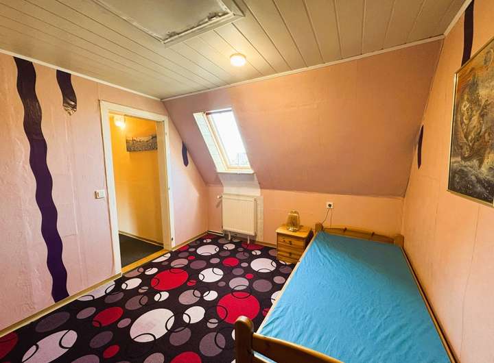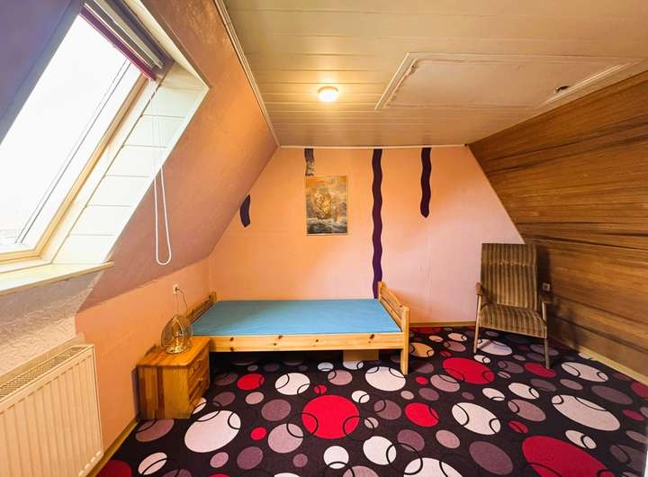 Das Schlafzimmer, das über ein Holz-Velux-Fenster verfügt, ist am Boden mit Teppich ausgelegt. Die Decke ist mit weißen Panelen verkleidet und bietet Ihnen einen Zugang zum Spitzboden. Der Spitzboden ist begehbar. Das Dach ist nicht bis in die Spitzen gedämmt.