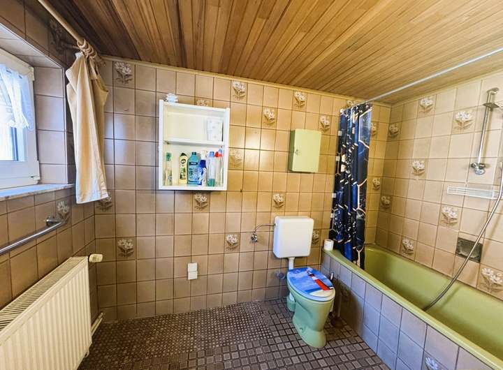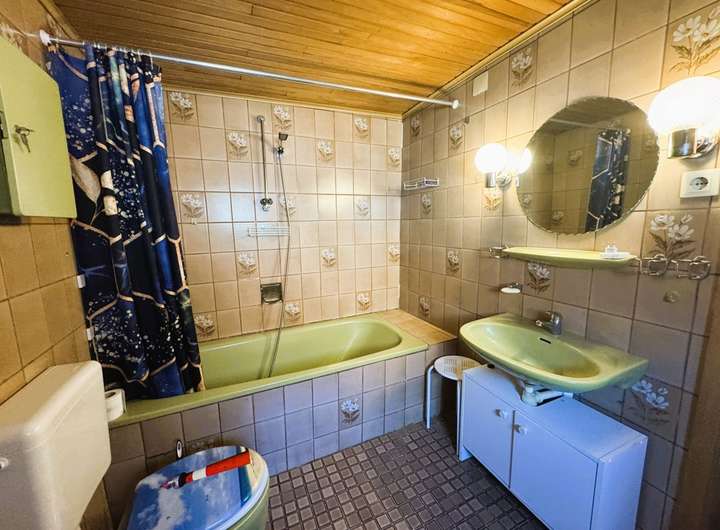 Vor Kopf befindet sich das Tageslicht-Badezimmer. Dieses ist mit einer Badewanne ausgestattet und bietet auch einen Stellplatz für eine Waschmaschine. Das Bad datiert noch aus früheren Zeiten.