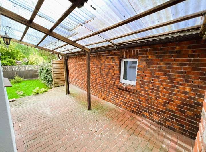 Der Außenbereich ist pflegeleicht angelegt. Eine überdachte Terrasse, ein kleiner Garten und ein Unterstand für die Mülltonnen sind hier zu finden.