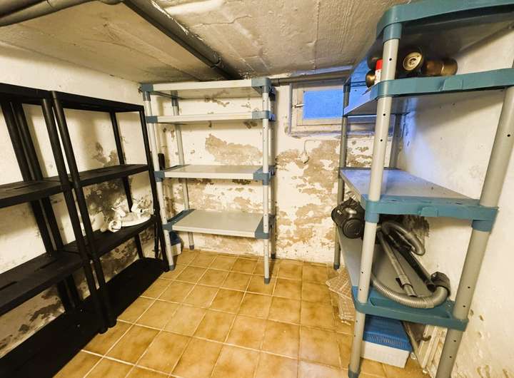 Zurück zum Flur. Dieser führt im hinteren Teil zum kleinen Teilkeller. Dieser verfügt über ein Fenster und ist ebenfalls gefliest.