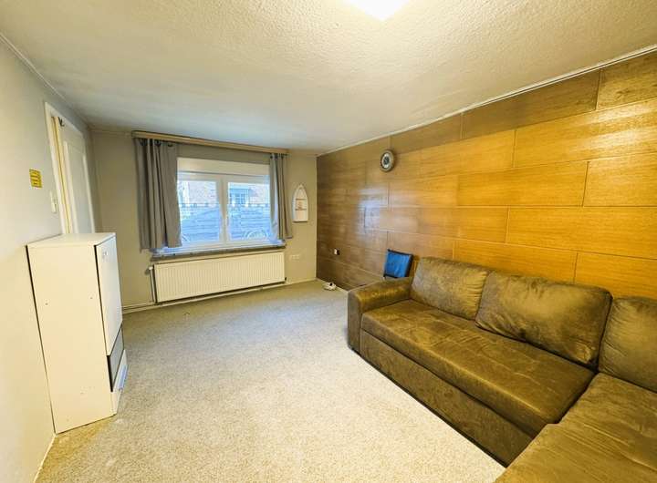 Links erreicht man das Wohnzimmer. Die Wände sind hier teilweise vertäfelt. Am Boden ist Teppich zu finden. Das Fenster wurde 2022 erneuert und ist mit einem Rollladen ausgestattet.