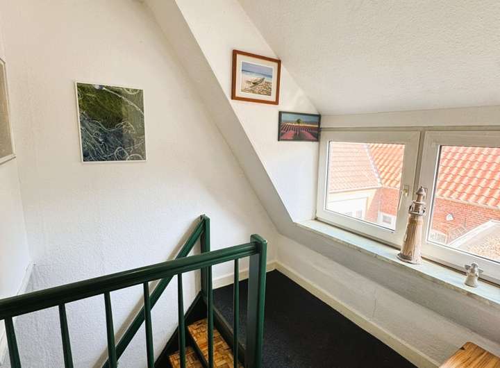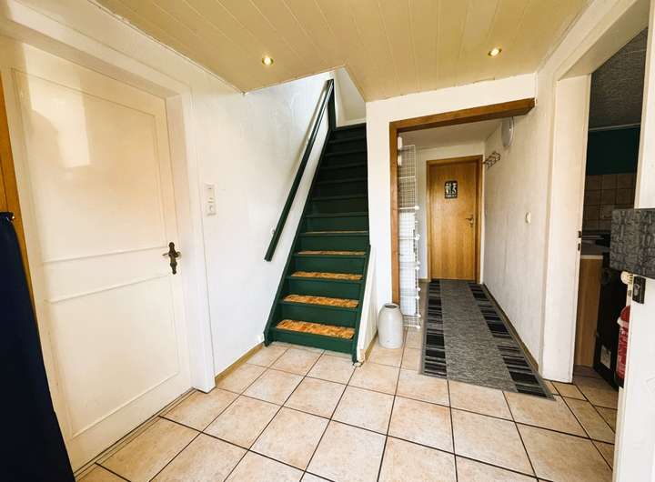 Über eine Holztreppe erreicht man vom Flur das Obergeschoss. Der Flur verfügt über ein Fenster und bietet Ihnen zusätzliche Abstellfläche. Am Boden ist Teppich zu finden.