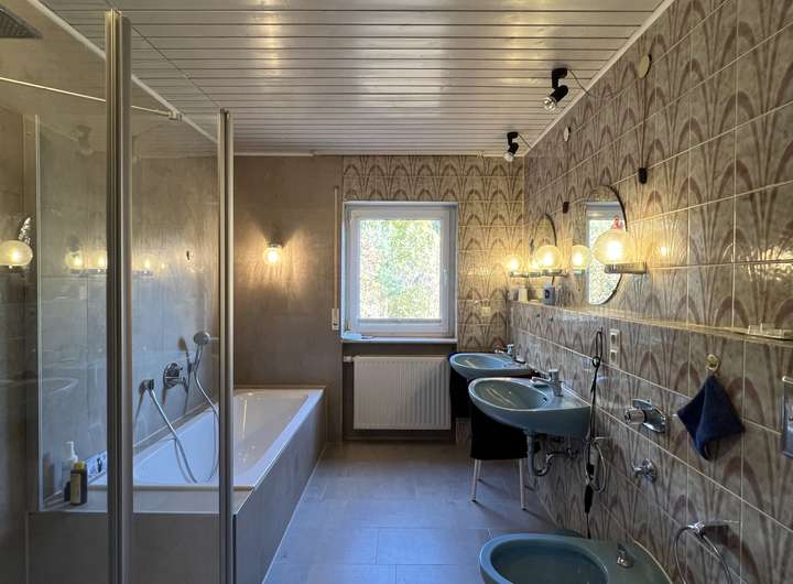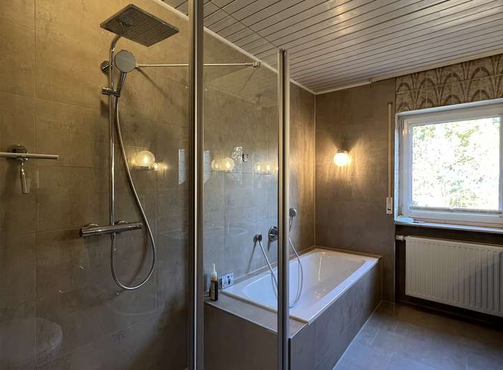 Die Einbauküche in der Hauptwohnung bietet eine funktionale Ausstattung, die den Bedürfnissen des täglichen Kochens gerecht wird. Das Tageslichtbadezimmer in der Hauptwohnung verfügt über eine begehbare Dusche und eine Badewanne. Ein Gäste-WC sowie ein über