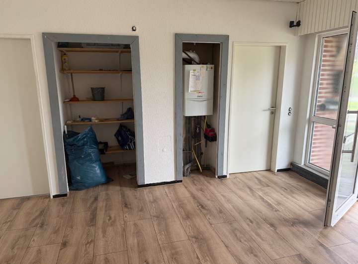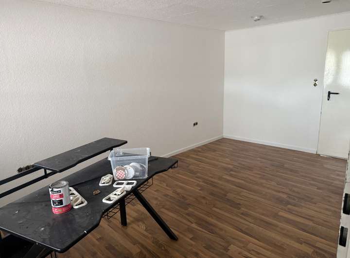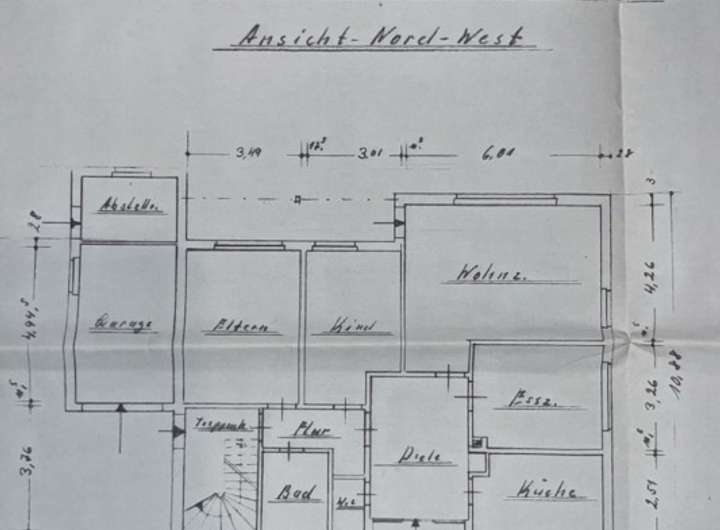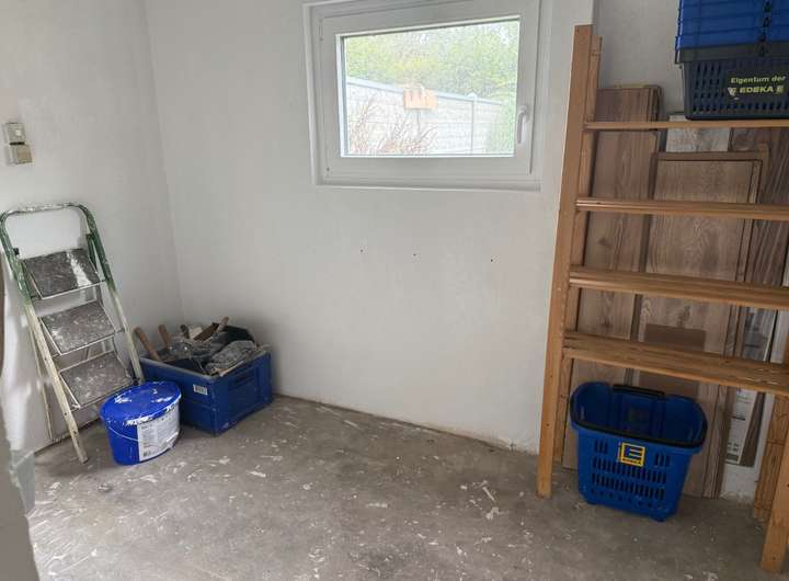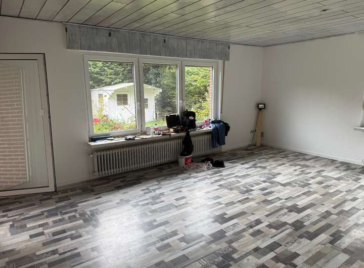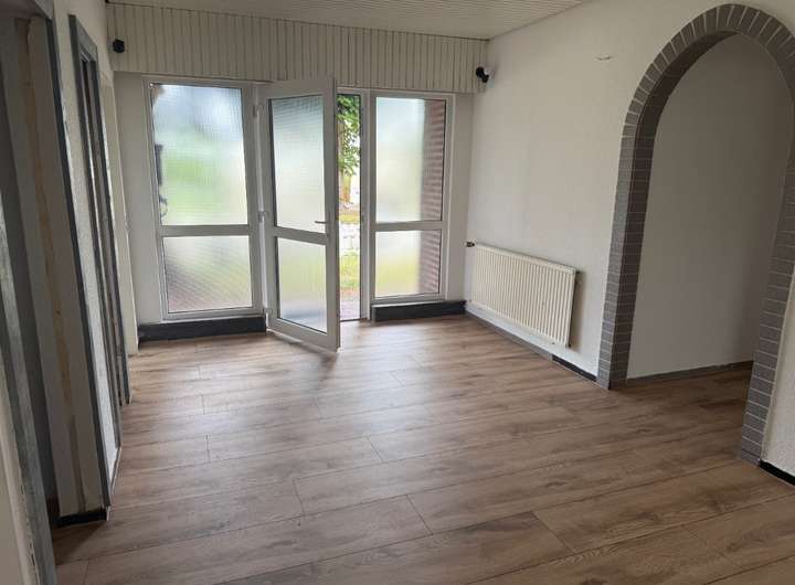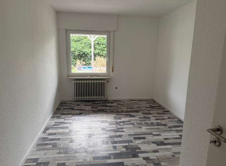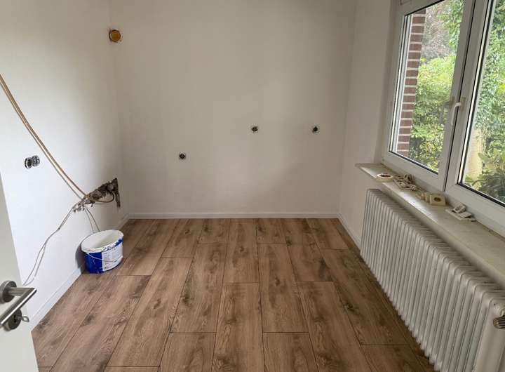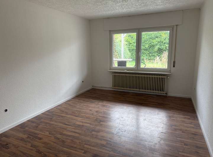 In der Erdgeschosswohnung sind drei Schlafzimmer, Wohnzimmer mit Zugang zum uneinsehbaren Garten (Südlage) einer Küche und einem Vollbad mit Fenster. Die angebaute Garage ist zu einem weiterem Zimmer (Büro) mit Abstellraum erweitert worden. Die Wohnung wird zur Zeit komplett renoviert und ist dann bezugsfrei bei der Übergabe.