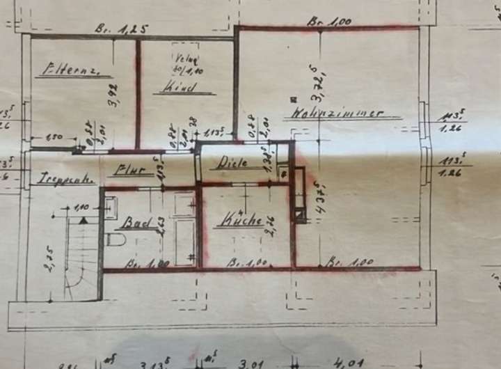 Die Obergeschoßwohnung mit separatem Eingang hat nochmals drei Zimmer, eine Küche, ein Vollbad mit Fenster und erzielte eine Kaltmiete über 800,00 Euro und hat einen separaten Eingang. Jede der beiden Wohnungen hat eine eigene Gasheizung und auch getrennte Gas- und Stromzähler.