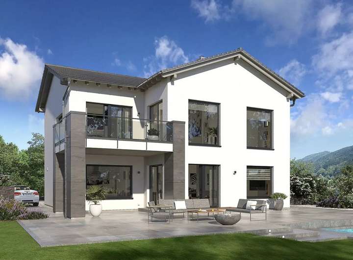 Die zeitlose Eleganz wird bereits an der Fassade sichtbar. Der Grundriss unter dem Satteldach ist so konzipiert, dass dank eines Rückversatzes im ersten Obergeschoss ein Balkon zum Verweilen und Entspannen einlädt, während darunter ein überdachter Terrassenbereich entsteht. Große Fensterfronten lockern die Fassade auf - und sorgen im Inneren für maximalen Lichteinfall. Apropos Inneres: